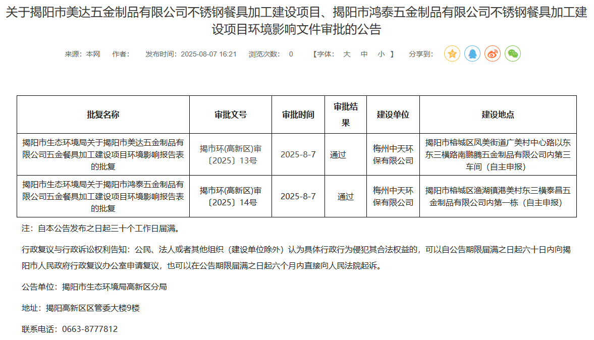 2025年8月7日,揭陽市生態(tài)環(huán)境局高新區(qū)分局就2個不銹鋼餐具加工建設(shè)項目環(huán)境影響報告表作出審批通過并對外進(jìn)行公告,公告期:自本公告發(fā)布之日起三十個工作日屆滿。